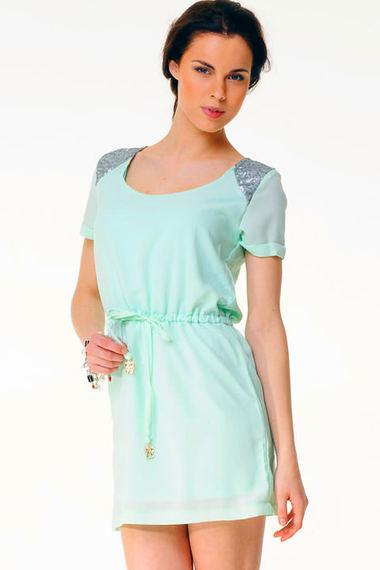 Воздушная туника ментолового цвета. Модель из тонкого полиэстера, с подкладом, на талии тонкий поясок на кулиске. Плечи расшиты серебристыми пайетками.