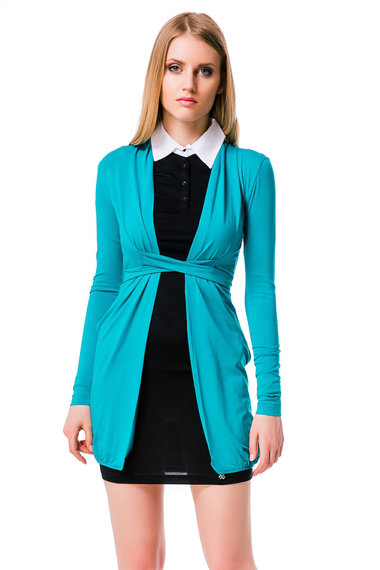 Элегантный кардиган без застежек, с длинными рукавами и завязками на талии. Модель из тонкого трикотажного полотна красивого зеленого оттенка.