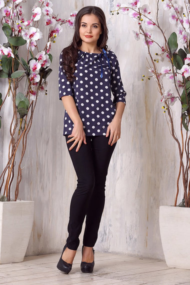 ОписаниеСтильная блузка темно синего цвета с принтом в крупный горох. Модель свободного кроя, удлиненная, с рукавами 2/4 и горловиной, собранной на кулиску с атласной ленточкой.